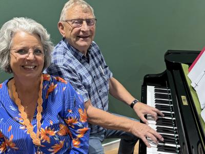 Bibliotekets sangfugl Lone synger for, og Ernest Pedersen håndterer klaveret til de danske schlagere fra dengang, før verden kunne streames.Hjørring BibliotekUdløbet